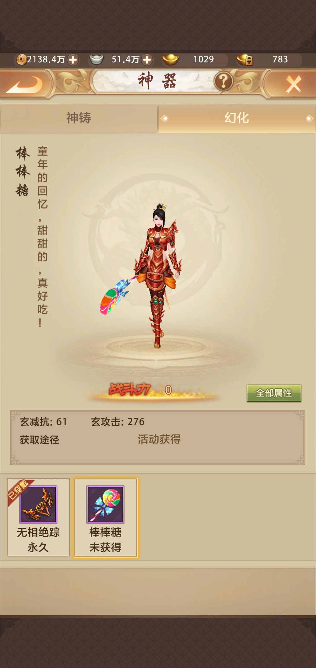 目前武器幻化只有棒棒糖,获取方式还不明确,但是加的战力以及属性非常的高。适合峨眉获取。